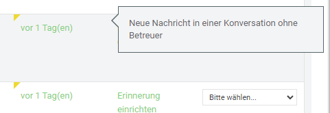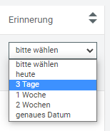 Erinnerungen: Es können individuelle Erinnerungen eingerichtet werden. Die Erinnerung bewirkt, dass Projekte mit gesetzten oder abgelaufenen Erinnnerungen oben angezeigt und gefiltert werden können. Eine Erinnerung kann sinnvoll sein, wenn ein Projekt nicht sofort in die nächste Phase wechseln möchte oder man das Projekt noch einmal anschauen möchte z.B. durch eine geplante Medienpräsenz.