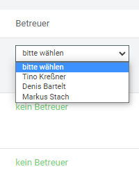 Projektbetreuer zuweisen bzw. wechseln: In der Spalte „Betreuer“ kann dieser zugewiesen werden. Wenn zusätzlich das Nachrichtensystem via equify auf der Plattform aktiv ist und der Projektbetreuende ausgewählt wurde, wird er zur Projektkonversation mit dem Projektinitiator hinzugefügt und die Konversation wird dann in der Konversatationsliste ausgegeben.