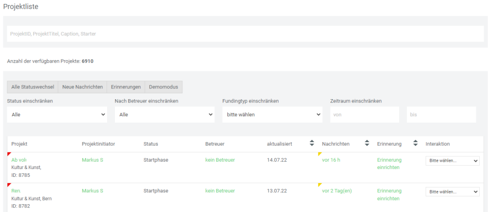 Suchen: Es kann über das Suchfeld nach Projekt-IDs, Projekt-Titel, der Caption (Projektlink) und Namen des Projektinitiators gesucht werden. Entsprechende Projekte werden aufgelistet und können ausgewählt werden (via ENTER).