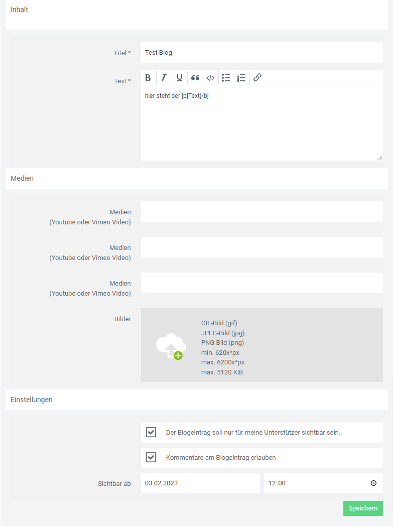 „Titel“ und „Text“ sind mit Sternchen * versehen und müssen ausgefüllt werden (Pflichtfelder).