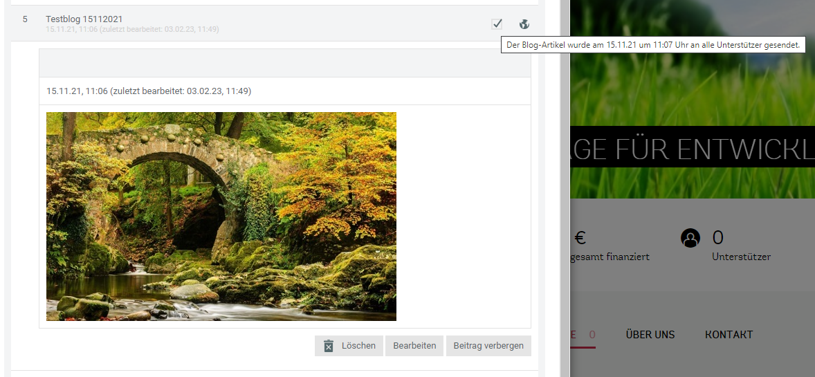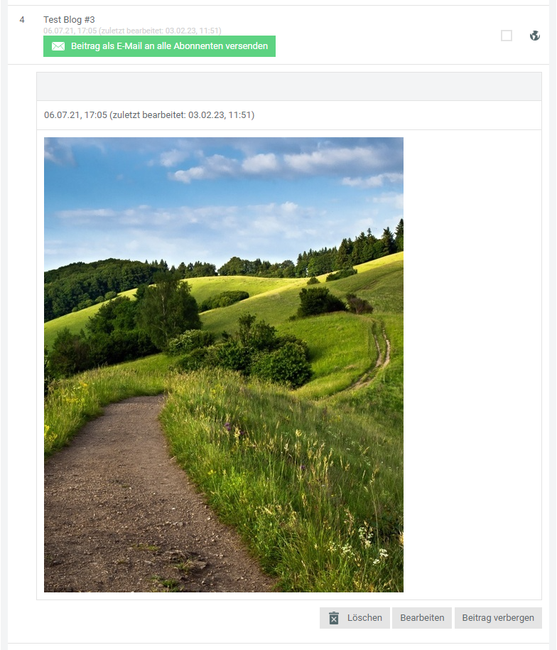 Ist das Modul „Blogeintrag per E-Mail versenden“ unter den Page-Modulen aktiviert und der Blog-Artikel veröffentlicht, erscheint ein Button, um den Blogeintrag per E-Mail an alle Abonnenten des Page-Blogs („Fans“) zu versenden.