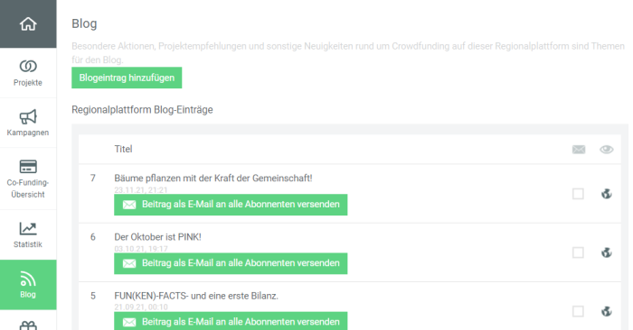 Klick auf „Blogeintrag hinzufügen“ öffnet die Eingabemaske, um einen neuen Blogeintrag anzulegen.