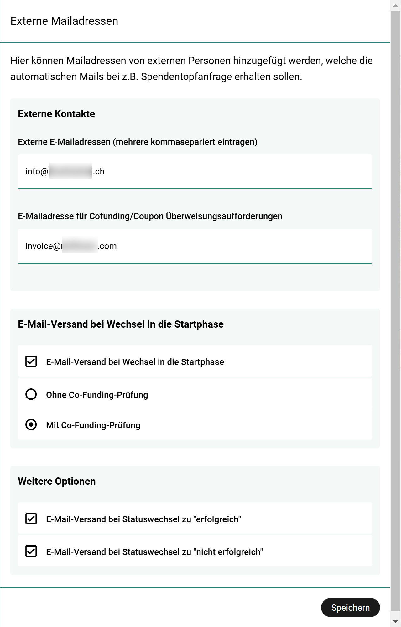 Zusätzlich kann eine s.g. Invoicing-E-Mail-Adresse hinterlegt werden, an welche Zahlungsauftrags-PDFs gesendet werden, sofern Co-Funding: Manueller Versand inkl. Zahlungsauftrag aktiv ist.