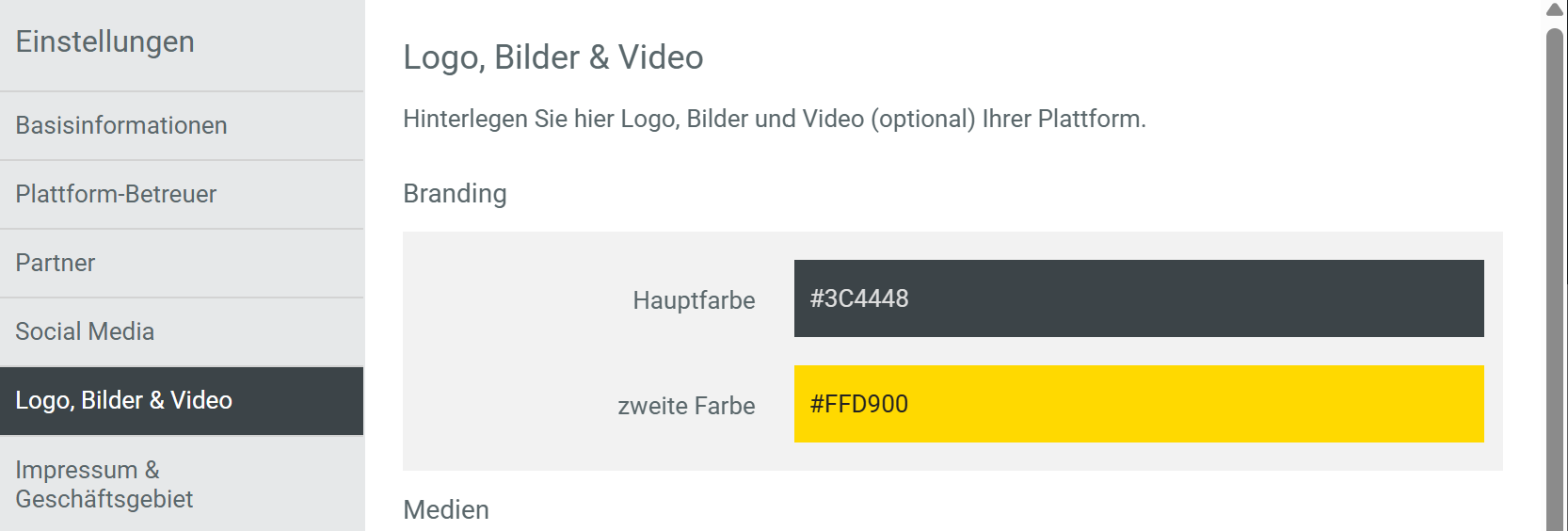 Je nach Plattformkonfiguration gibt es hier verschiedene Social-Media-Kanäle zur Pflege. Die Website und die vorhandenen Social-Media-Kanäle der Page können hier verlinkt werden.