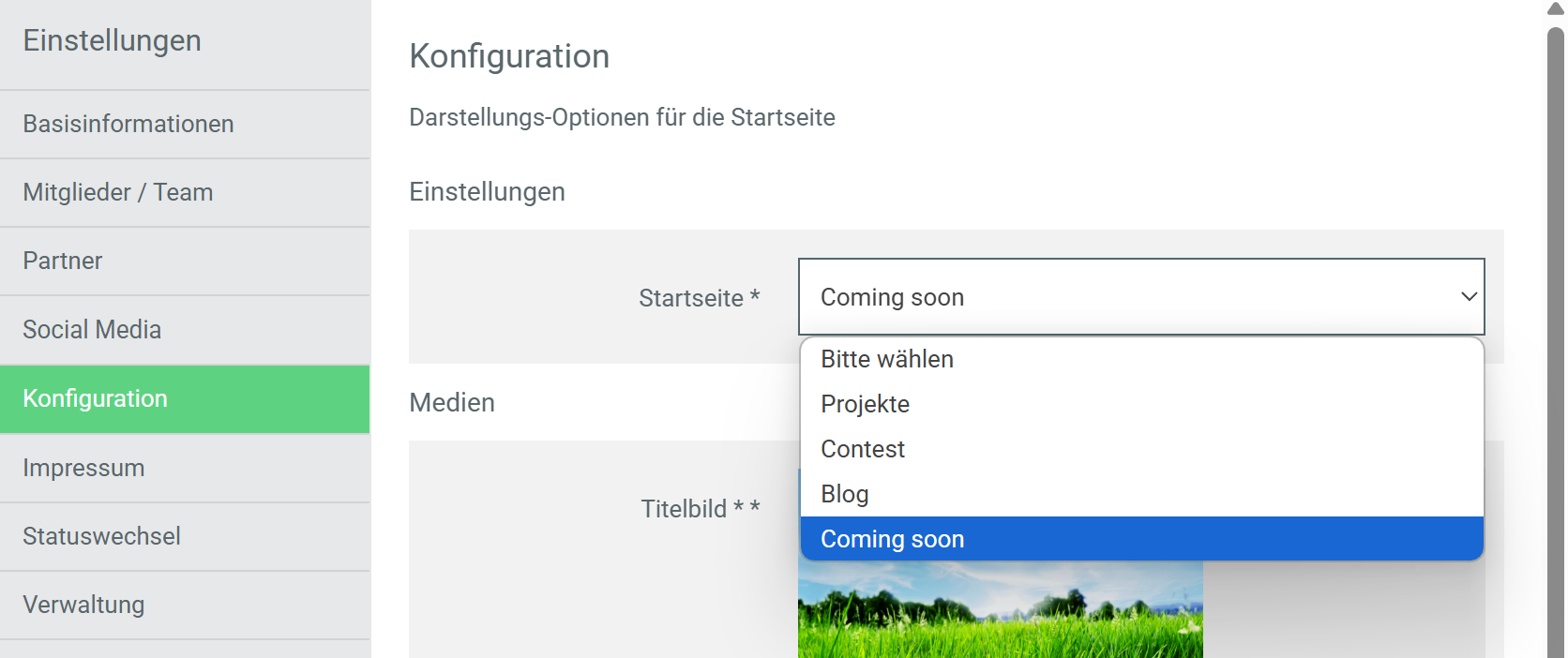 Für Gäste/Besucher, die kein Page-Mitglied oder Manager sind, kann eine Landingpage, sogenannte Coming-Soon-Seite, vorgeschaltet werden. Somit kann die Page bereits öffentlich in einer Page-Liste angeteasert bzw. der Page-Link in der Außenkommunikation veröffentlicht werden, ohne dass die Page vollkommen in ihrem finalen Erscheinungsbild und Page-Funktionen aufrufbar sein muss.
