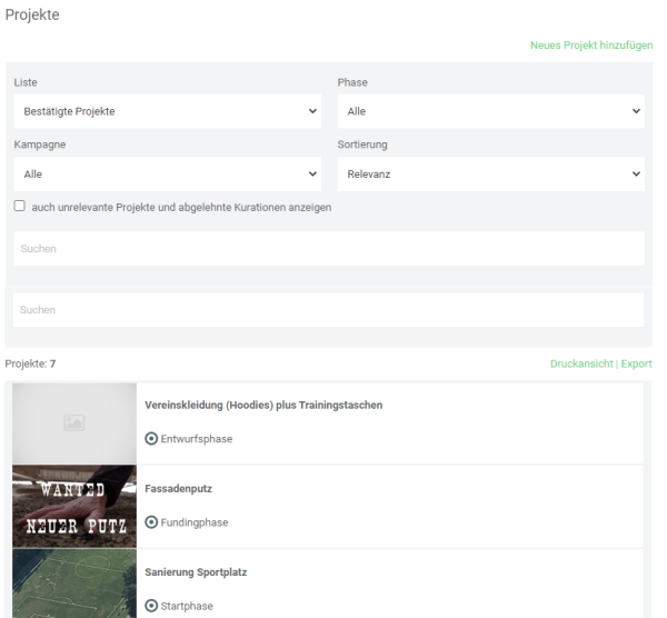 Über die Ergebnisliste können durch Klick auf eine Projektkachel, die Projektdetails, als auch die zugeordneten Kampagnen mit ihrem aktuellen Status angezeigt werden.