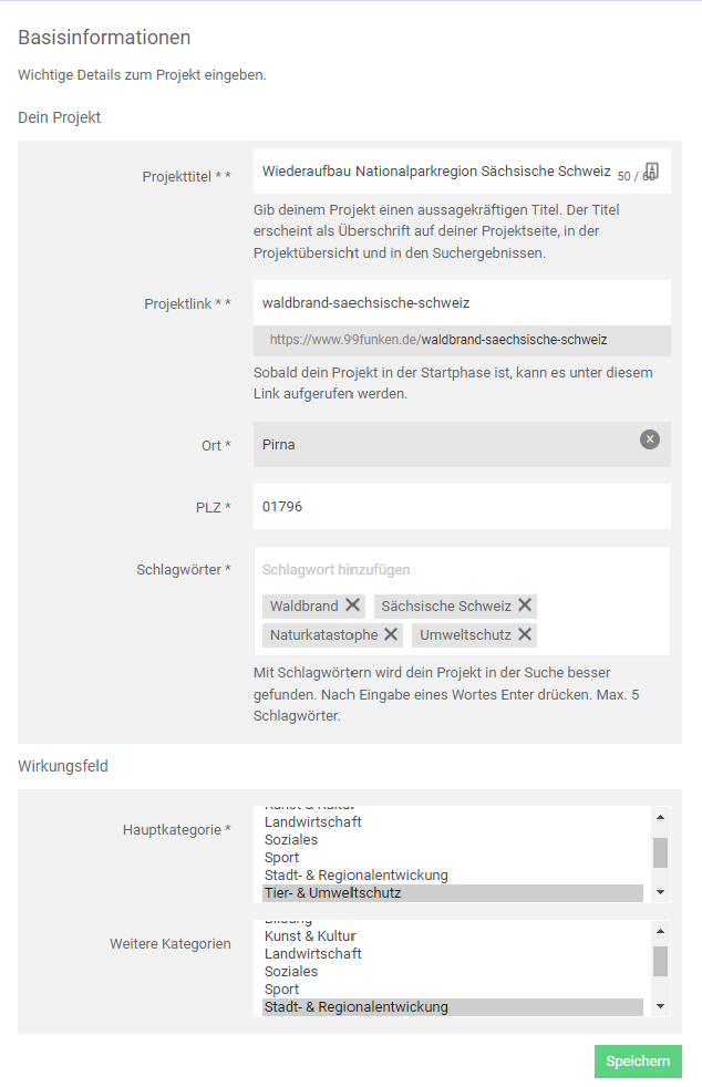 - Kategorien / Wirkungsfeld: Das Projekt kann durch die Zuweisung in einer oder mehrere Kategorien besser zugeordnet werden. Nutzer könnnen Projekte nach Kategorien filtern.