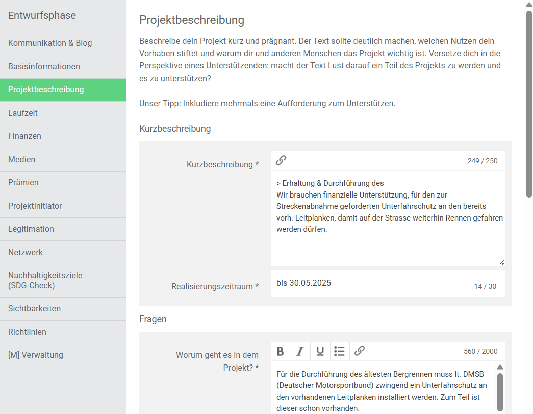 Projektinitiatoren sollen hier in der Kurzbeschreibung und in der ausführlichen Darstellung ihr Projekt prägnant beschreiben, um möglichst viele Seitenbesucher von einer Spende zu überzeugen.