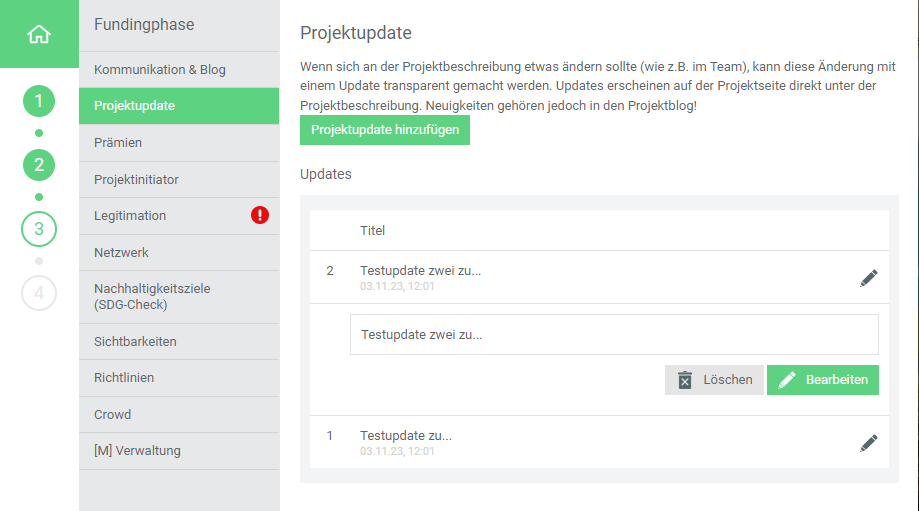Der Tab „Projektupdate“ ist in der Funding- und Abschlussphase sichtbar.