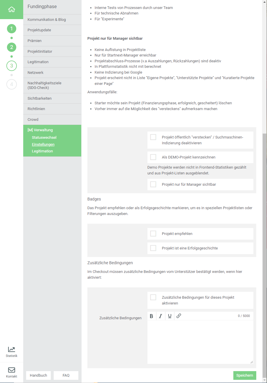 - Starter möchte sein Projekt (Finanzierungsphase, erfolgreich, gescheitert) nicht mehr öffentlich darstellen, nicht mehr in Suchmaschinen auffindbar sein und den Zugriff auf der Projektlink unterbinden