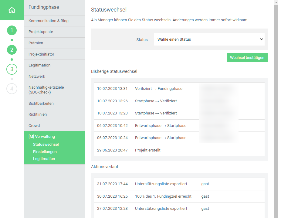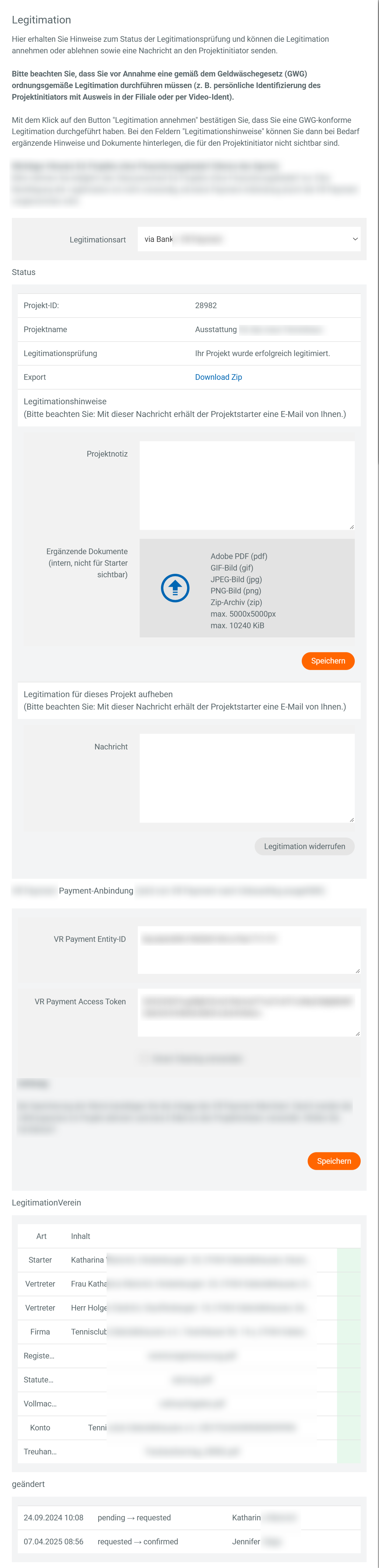 Diese Ansicht dient der Bearbeitung der Anträge, die der Projektinitiator im Rahmen der Legitimation eingereicht hat.