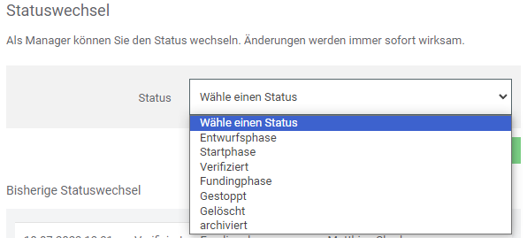 Bearbeiter können hier den Status eines Projektes mit und direkt ohne Antrag des Starters wechseln.