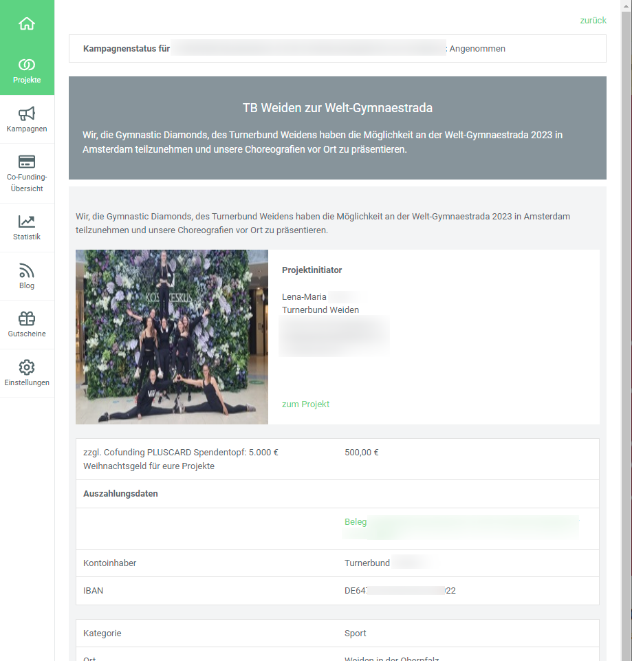 Die Page erhält dort zusätzlich einen Co-Funding-Beleg (PDF) über ihre Zuschüsse mittels Co-Funding je Projekt und Kampagne.